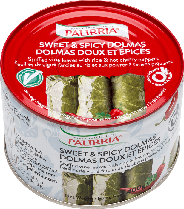 52% riz cuit , 10,8% Poivrons – cerises piquants , 10 feuille de vigne ,eau ,huile de soja,oignons ,mini poivrons ,sucre ,persil ,sel ,sucre inverti ,vinaigre de vin rouge ,tabasco ,poivre noir ,