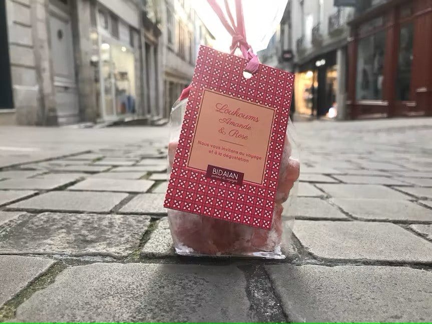 Loukoum de rose à l’amande, douceur légèrement fruité au parfum délicat de la rose, avec des morceaux d’amande, produits couramment déguster en Grèce, Turquie, Afghanistan, Albanie……